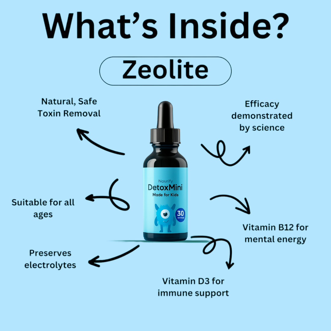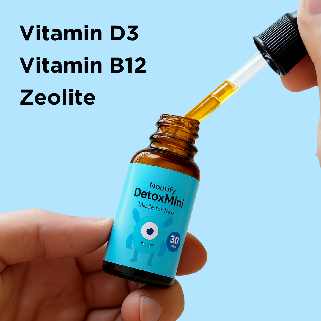 Nourify DetoxMini es un suplemento líquido apto para niños y aprobado por padres, diseñado para favorecer suavemente la desintoxicación natural, una mayor claridad en el habla, una mejor concentración y el bienestar general. Elaborada con ingredientes naturales sin OGM, esta mezcla, formulada por pediatras, incluye zeolita, vitamina B12, vitamina D3 y folato (vitamina B9), cuidadosamente seleccionados para ayudar a depurar el organismo y favorecer la salud cognitiva y del desarrollo.